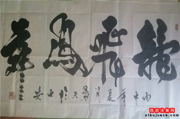 龍乃華人想象中最尊貴、最吉祥之物。生活之中無(wú)所不在,上下五千年,仍一以貫之,舉世無(wú)與倫比。華人更以龍的傳人自居,一旦風(fēng)起云涌,海生駭浪,則龍卷風(fēng)云,霞光萬(wàn)丈。其“一筆龍”書(shū)法作品將書(shū)法和繪畫(huà)非常巧妙的而高度的融合,依易經(jīng)智慧,集意念、氣功為一體,運(yùn)筆如神,酬勁有力,一氣呵成,氣勢(shì)磅礴,形象逼真。整個(gè)字體呈現(xiàn)出一條蒼龍騰躍飛天之勢(shì),寓意了中國(guó)龍騰飛吉祥的福兆,更展現(xiàn)了中華民族不屈不饒的民族精神。