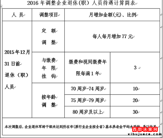 此次調(diào)整的人員是指,在2015年底以前按規(guī)定辦理了退休手續(xù)的企業(yè)和機關(guān)事業(yè)單位退休人員(含退職人員,不含新中國成立前參加革命工作享受本人原工資100%退休金待遇的老工人,下同)的基本養(yǎng)老金(含退職生活費,下同)進行調(diào)整提高。