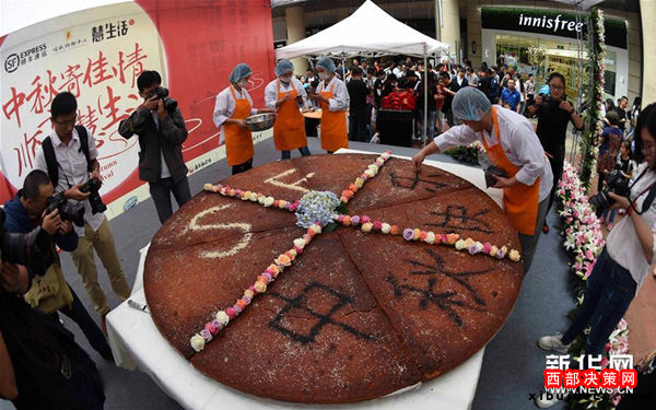 2016年9月3日,在云南昆明一購(gòu)物中心展出了一個(gè)直徑約2.4米的巨型月餅。這個(gè)巨型月餅是以火腿、食用玫瑰等材料純手工制作而成,總重量達(dá)上百斤。