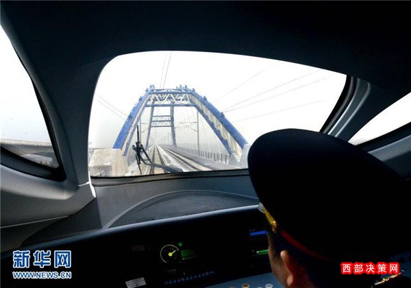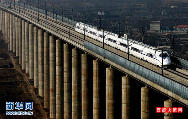 一列試運(yùn)行的動(dòng)車組列車從鄭西高鐵三門峽附近的一座特大型橋梁上駛過(2010年1月16日攝)。