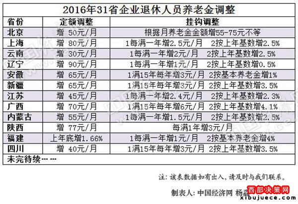以云南為例,繳費(fèi)年限每滿一年每人每月增加2元,再按本人2015年12月基本養(yǎng)老金的2.5%增加調(diào)整。安徽規(guī)定,繳費(fèi)年限滿15年后滿一年每人每月增加3元,再按本人2015年12月基本養(yǎng)老金的1%增加調(diào)整。中國經(jīng)濟(jì)網(wǎng)統(tǒng)計(jì),已公布方案省份,大多以此進(jìn)行掛鉤調(diào)整。