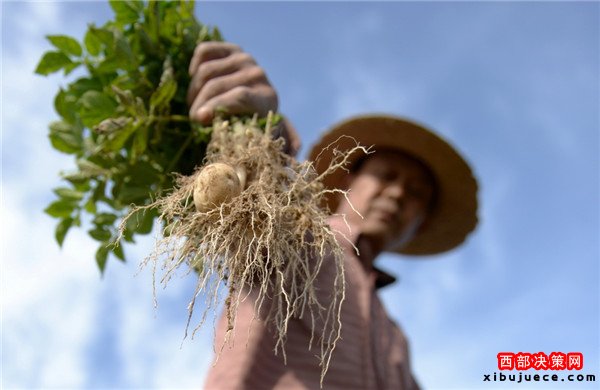 9月28日,在定西市隴西縣德興鄉(xiāng)營門村,一位農民展示受旱情影響導致不足雞蛋大小的馬鈴薯。