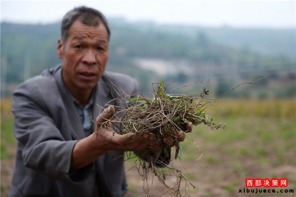 9月28日,定西市渭源縣清源鎮(zhèn)崔家河村,一位農民展示從地里挖出來的已經旱死的黨參。