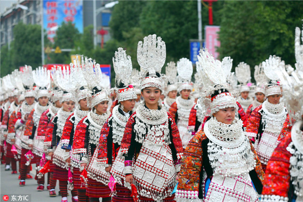 2016年10月11日,貴州省黔東南劍河縣城少數(shù)民族同胞身著節(jié)日盛裝巡游,歡慶仰阿莎節(jié)。當(dāng)日,劍河縣在縣城舉行隆重的仰阿節(jié)文化節(jié)暨縣城搬遷10周年慶?;顒?dòng),此次活動(dòng)為期三天10月10日至12日。