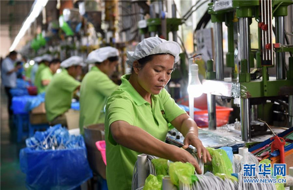 廣西都安瑤族自治縣農(nóng)民進城創(chuàng)業(yè)園一家企業(yè)的工人在生產(chǎn)作業(yè)中。