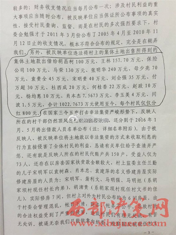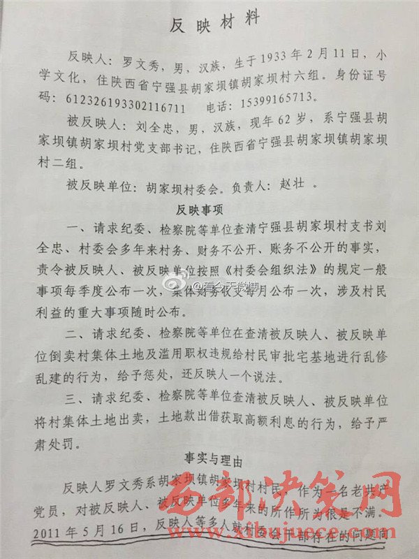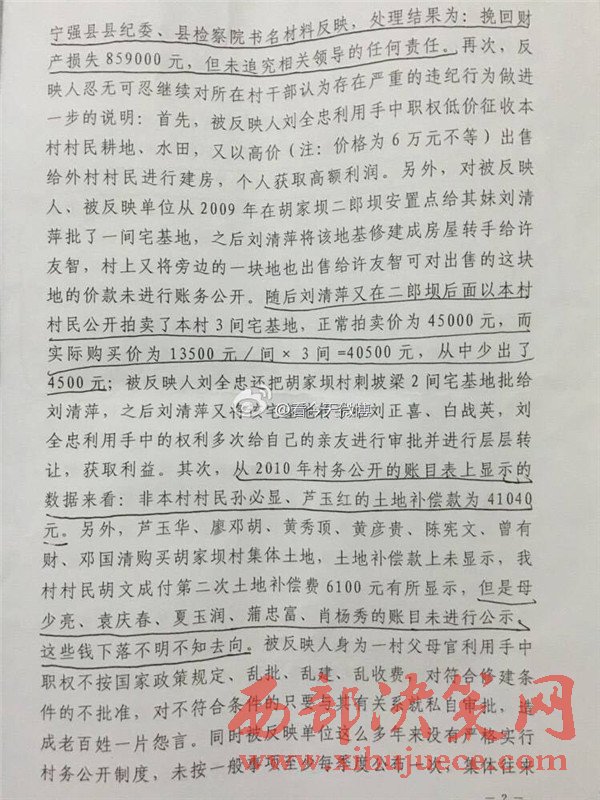 西部決策網(wǎng)訊   近日,有網(wǎng)友微博爆料,陜西省漢中市寧強縣胡家壩鎮(zhèn)胡家壩村,村干部劉全忠利用惠民政策,套取國家大量資金。對于國家扶貧項目,巧立名目、貪污、侵占村民利益。濫用職權(quán)違規(guī)審批宅基地,倒賣村集體土地,并將村上千萬余元出借他人賺取利息,且村務(wù)不公開、賬務(wù)弄虛作假、嚴(yán)重違紀(jì)行為。