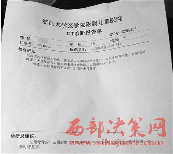 為了確認(rèn)孩子的傷情,我和幼兒園的園長帶著孩子到了杭州的一家醫(yī)院進(jìn)行檢查,檢查結(jié)果顯示孩子臉部骨折。