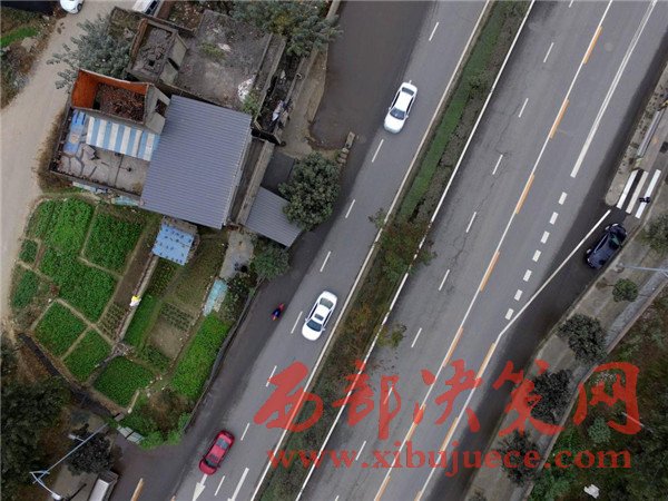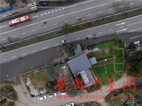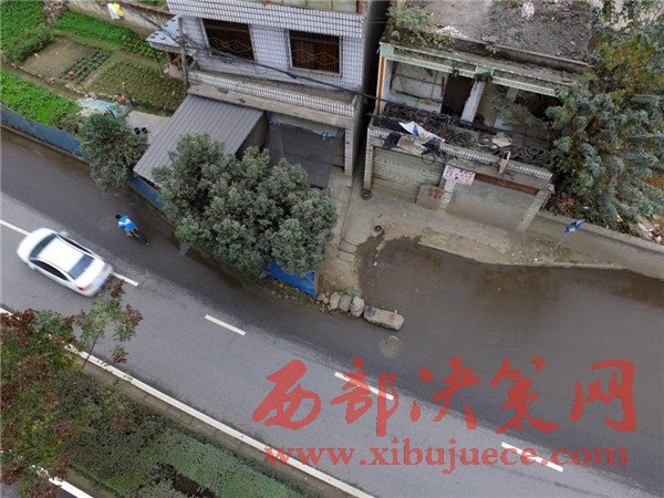 這棟房子屋前的院壩、自留地占據(jù)了進方向的兩條車道。2008年擴建這條路之前,這棟民房就已經(jīng)立在這里,至今已有8年時間。