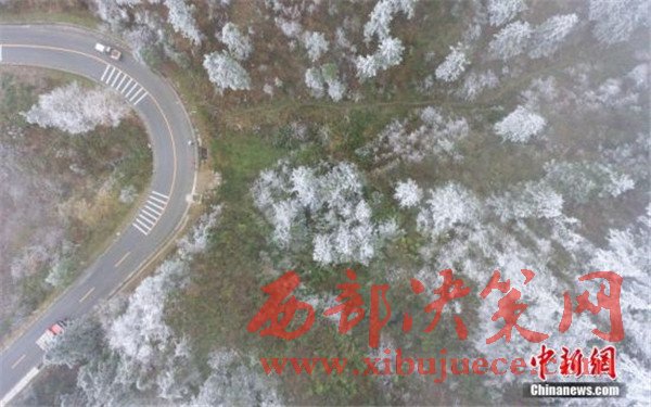 11月24日,航拍雷公山霧凇景觀。據(jù)貴州省氣象臺預(yù)報(bào),受強(qiáng)冷空氣影響,貴州省大部地區(qū)降溫幅度都在8到16℃之間,部分地區(qū)出現(xiàn)雨夾雪。位于貴州省雷山縣的雷公山國家森林公園出現(xiàn)霧凇景觀,美不勝收。