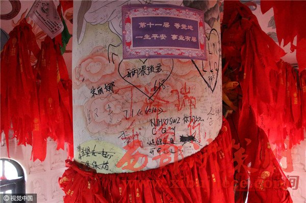 日前,向游客免費(fèi)開(kāi)放的山東省無(wú)棣縣大覺(jué)寺海豐塔內(nèi)壁遭到游客涂鴉,幾乎每一層內(nèi)墻壁都被刻滿了情話和祝福語(yǔ),連墻壁裝飾的佛像圖畫都不能幸免。圖為海豐塔內(nèi)壁遭游客涂鴉,刻滿了情話和祝福語(yǔ)。