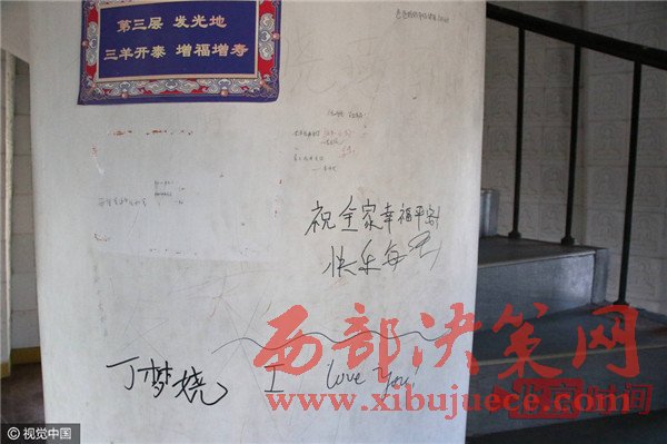 山東無(wú)棣,海豐塔內(nèi)壁遭游客涂鴉,刻滿了情話和祝福語(yǔ)。