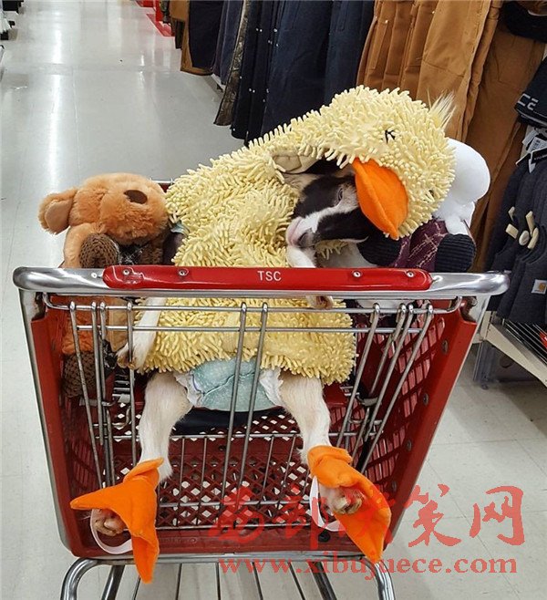 有時候琳恩出門又不能把Polly一個羊扔在家里的時候,就會給小家伙套上鴨子服,帶它出去。被打扮成鴨子的小羊在陌生的環(huán)境里也不再害怕,還在購物車里打了個小盹。