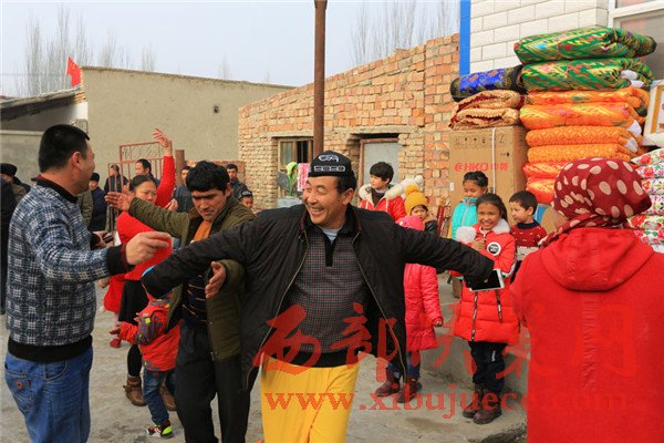 人逢喜事精神爽,女主人巴哈爾古麗·吾斯曼站在門口,滿面春風(fēng)笑迎每一位前來賀喜的客人,并不時(shí)踮腳伸長脖子向村頭路口張望——她還在等一位特殊的客人。