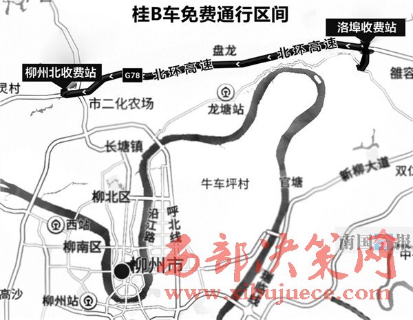 昨 日,記者從柳州市城市投資建設發(fā)展有限公司(下簡稱“城投”)了解到,城投和廣西交通投資集團(下簡“交投集團”)達成協(xié)議,對在柳州北環(huán)高速公路柳州北 收費站和洛埠收費站區(qū)間通行(即柳州北收費站入、洛埠收費站出,或洛埠收費站入、柳州北收費站出)的“桂B(yǎng)”車牌車輛(下簡稱“桂B(yǎng)車”),車輛通行費由 柳州市財政統(tǒng)繳,司機在收費現(xiàn)場不需付費。