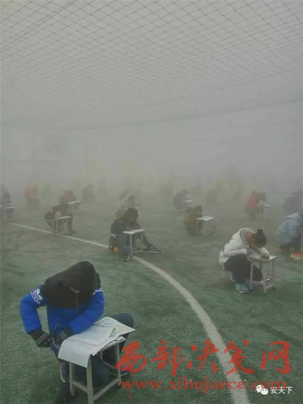 投訴人閆先生給記者發(fā)來兩張照片,照片顯示,天氣灰蒙蒙的,在一個(gè)露天的足球場上,很多學(xué)生半蹲著趴在凳子上做卷子,由于霧霾太大,第2排后面的學(xué)生身影已經(jīng)很模糊。20日下午3時(shí)50分左右,大河報(bào)記者趕到林州,當(dāng)?shù)氐目諝忪F霾十分嚴(yán)重,能見度只有二三百米。在臨淇鎮(zhèn)一中學(xué)校附近,記者見到了閆先生。他告訴記者,現(xiàn)在學(xué)校已經(jīng)知道記者要來采訪了,臨時(shí)放假了,考試也取消了。隨后,在校門口,該校八年級(jí)的一名學(xué)生告訴記者,學(xué)校確實(shí)確實(shí)在12月19日考試了,上午考英語和數(shù)學(xué),下午考語文和物理。該學(xué)生告訴記者,八年級(jí)共十個(gè)班,每個(gè)班六七十人,大家都參加了考試,“在操場上考的,搬著凳子在外面”。
