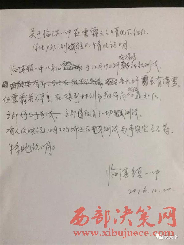 馮校長出示了一份手寫的情況說明:臨淇鎮(zhèn)一中八年級(jí)于12月19日上午在操場組織測試,當(dāng)天上午雖有薄霧,但霧霾并不嚴(yán)重,在接到林州市教體局的通知后立即取消了一切測試。有人反映說12月20日上午還在測試,與事實(shí)完全不符。特此說明。“為什么有學(xué)生說19日下午也考試了?”記者追問,并說出了考試的科目。馮校長尷尬地笑笑:“組織都組織了,就考完吧。”據(jù)馮校長介紹,當(dāng)時(shí)并沒有這么多學(xué)生在操場考試,有一部分學(xué)生在教室考的,在操場上考試的只有480多名學(xué)生。到底是什么樣的考試如此急迫,讓學(xué)生頂著霧霾也要進(jìn)行?馮校長說,學(xué)生課講完了,這次考試是一個(gè)摸底測驗(yàn)考試,也沒有那么急迫。