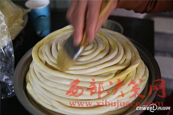 問賀玉蘭老人做得一碗好面有啥竅門,賀玉蘭老人說(shuō):“有啥竅門?實(shí)實(shí)在在做就成,一個(gè)是面要揉好、揉成光光亮亮的軟面團(tuán),揉好的面醒2個(gè)小時(shí)后就可以搓成粗條子盤放在盆子里,一層層碼放,刷上菜籽油,一個(gè)是防止面粘在一起,另外也能使面口感更爽滑,盤放好后再醒2個(gè)小時(shí)。”