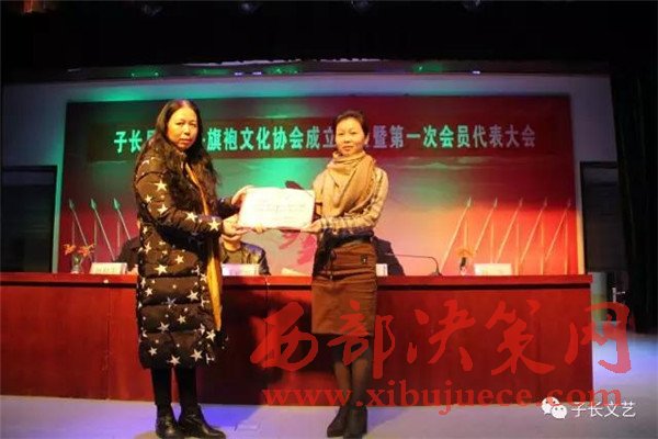 在會上,山丹丹旗袍文化協(xié)會的負(fù)責(zé)人白潔做了協(xié)會前期籌備工作的簡述,文廣局副局長宣讀了同意子長縣山丹丹旗袍文化協(xié)會成立的批復(fù);民政局副局長趙和平頒發(fā)社會團(tuán)體登記證。會中還進(jìn)行了對協(xié)會的理事會,監(jiān)事會,主席團(tuán)成員的選舉。當(dāng)選為協(xié)會主席的白潔在會上做了表態(tài)發(fā)言,并代表協(xié)會向協(xié)會的顧問李建中、王明如,名譽主席王晶、張琴頒發(fā)了聘書。最后,協(xié)會會員還為觀眾們準(zhǔn)備了一道文藝表演的盛宴,大會在星光大道歌手孫秸的一曲《山丹丹開花紅艷艷》中勝利中閉幕。