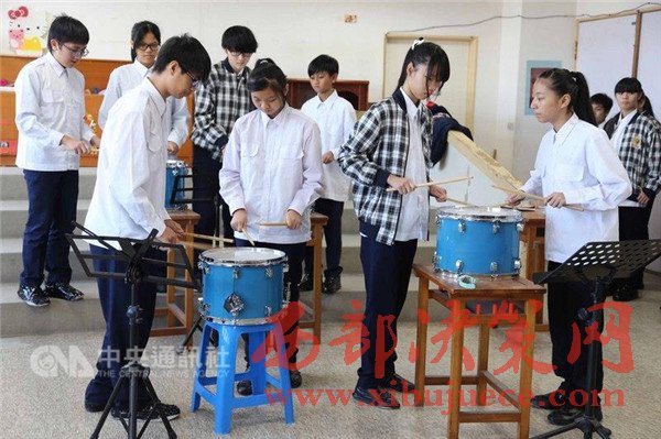 社團(tuán)音樂老師趙純瓏說,打擊樂團(tuán)有16名成員,原本是豎笛社團(tuán),但發(fā)現(xiàn)孩子們經(jīng)常隨著節(jié)奏拍打大腿或拍桌,非?;顫娪志咭魳诽旆郑赃@學(xué)期才成立打擊樂團(tuán)。
