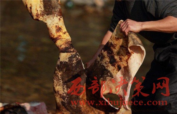 燒好的大黃牛,皮都已經(jīng)焦黃,遠遠的都能聞到一股燒焦的氣味。放到水里洗干凈,然后由專人開膛破腹。