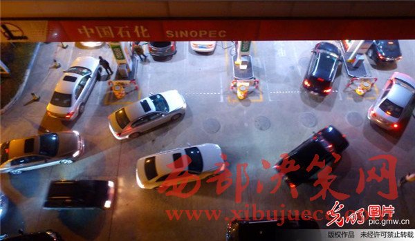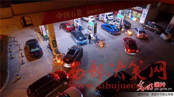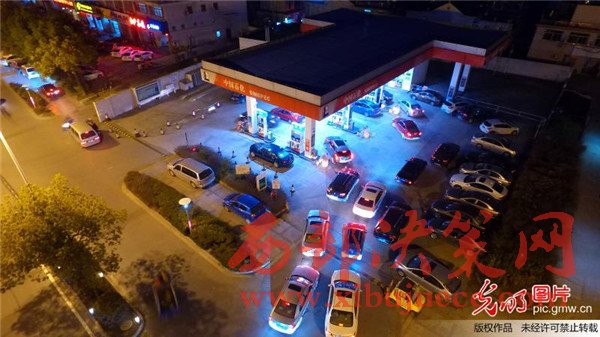 2017年1月12日晚,航拍揚(yáng)州一家加油站,車主排隊等待加油。