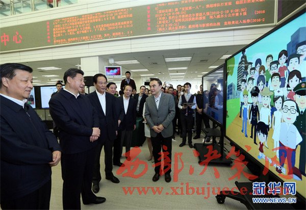 2016年2月19日,中共中央總書記、國家主席、中央軍委主席習近平在北京主持召開黨的新聞輿論工作座談會,并到中央新聞單位調(diào)研。這是習近平在新華社觀看新聞信息產(chǎn)品展示。新華社記者蘭紅光攝
