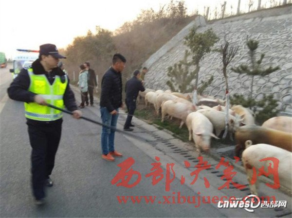 2日下午4:30左右,滬陜高速由洛南開往咸陽方向,一輛運送生豬的貨車在西安段由于駕駛員操作不當,造成貨車側(cè)翻,車上的40頭生豬從車里“逃”了出來,在高速路上肆意奔跑撒歡,成了追風的“二師兄”。