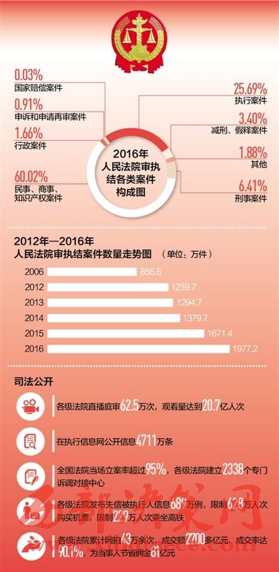 2016年,各級(jí)法院向執(zhí)行難全面宣戰(zhàn),共受理執(zhí)行案件614.9萬(wàn)件,執(zhí)結(jié)507.9萬(wàn)件,同比分別上升31.6%和33.1%,執(zhí)行到位金額1.5萬(wàn)億元,同比上升54%。與公安部等10多個(gè)部門建立網(wǎng)絡(luò)執(zhí)行查控系統(tǒng),執(zhí)行法官足不出戶即可依法查詢被執(zhí)行人財(cái)產(chǎn)和相關(guān)信息,實(shí)現(xiàn)了執(zhí)行模式的根本變革。發(fā)布失信被執(zhí)行人信息689萬(wàn)例,限制628萬(wàn)人次購(gòu)買機(jī)票,限制229萬(wàn)人次乘坐高鐵。依法懲治拒不執(zhí)行裁判行為,司法拘留1.6萬(wàn)人,追究刑事責(zé)任2167人,讓司法裁判真正成為懲治違法失信的利劍。