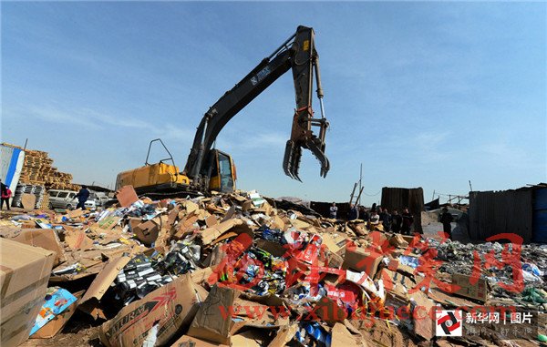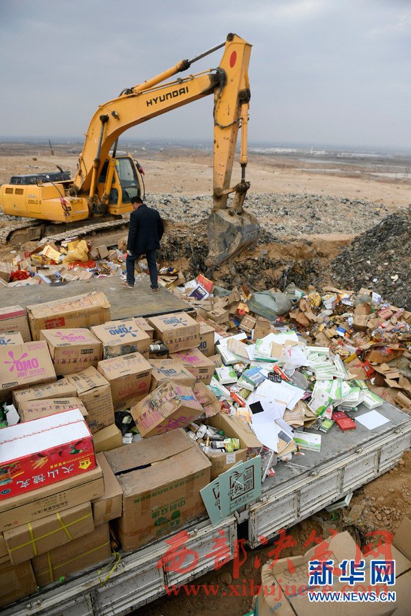 3月14日,在寧夏寧東垃圾填埋場(chǎng),工作人員將假冒偽劣商品進(jìn)行填埋處理。“3·15”國(guó)際消費(fèi)者權(quán)益日即將到來之際,銀川市市場(chǎng)監(jiān)督管理局集中展示并銷毀食品、藥品、電器等32個(gè)類別的假冒偽劣商品。