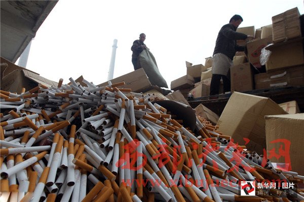 2015年3月13日,河南許昌,工作人員將假冒偽劣香煙傾倒在焚燒爐旁,準(zhǔn)備用于燃燒發(fā)電。