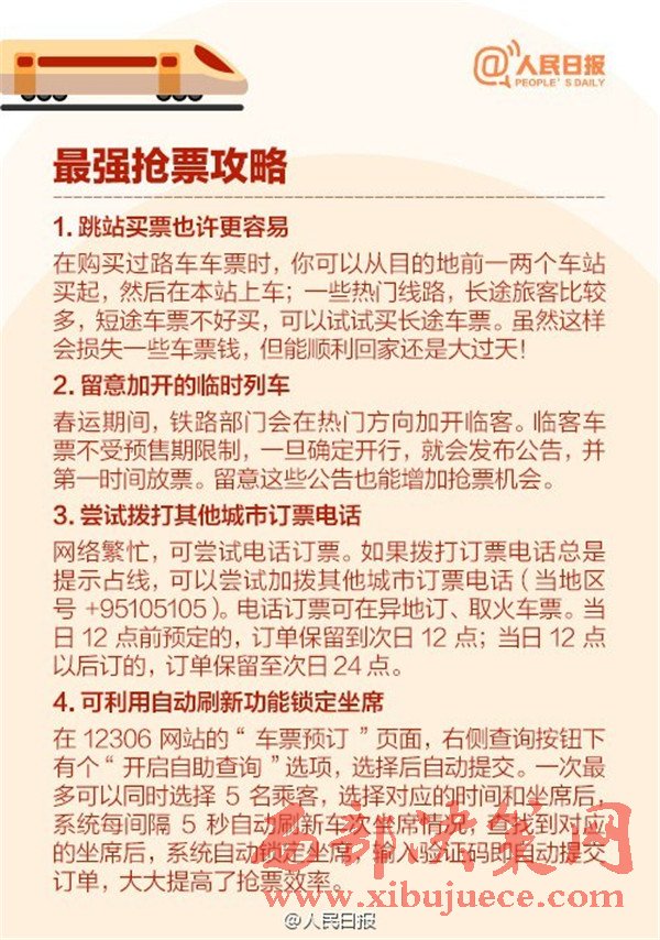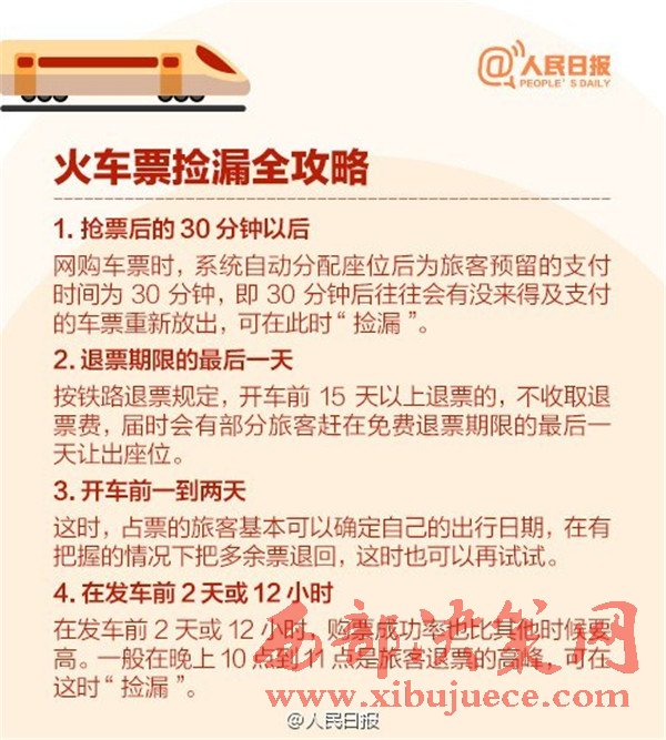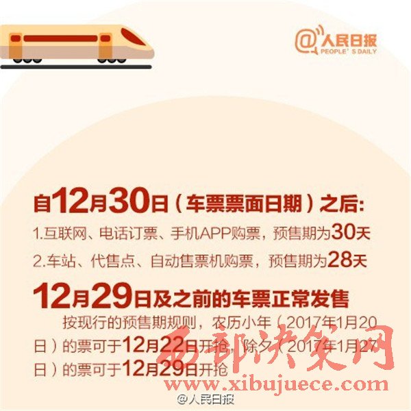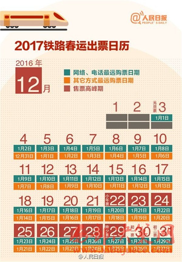 2017年春運(yùn)從1月13日至2月21日,是近5年來(lái)開(kāi)始時(shí)間最早的春運(yùn),你做好搶票準(zhǔn)備了嗎?目前火車(chē)票預(yù)售期30天,除夕當(dāng)天的票12月29日開(kāi)搶,網(wǎng)絡(luò)購(gòu)票須在30分鐘內(nèi)付款,發(fā)車(chē)前2天或12小時(shí)可“撿漏”。