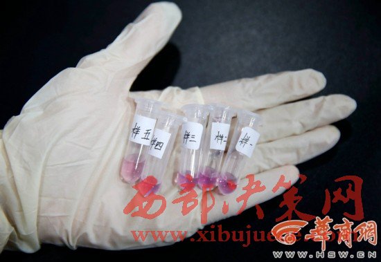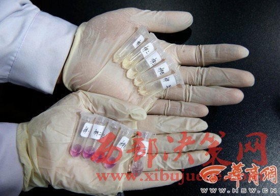 3.從1-5號(hào)浸泡液中取出200微升,滴在1.5ml的離心管里,滴加2滴硫酸鎂試劑1號(hào)(紫色),若顯色管中呈藍(lán)色,疑為摻硫酸鎂;