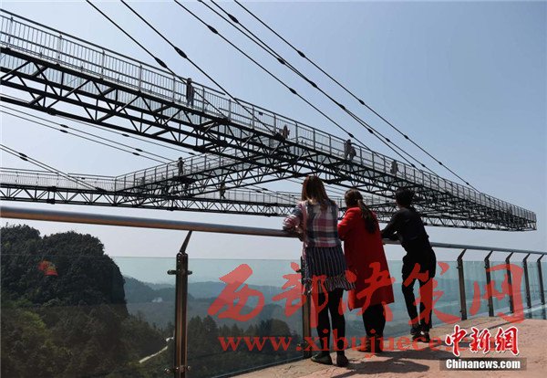 4月6日,重慶一景區(qū)內(nèi)“天空懸廊”吸引眾多市民前往體驗。懸廊成“A”字形,橋面鋪設(shè)全透明玻璃,由于懸空于近300米高的懸崖峭壁之上,又沿懸崖向外延伸在80米的空中,因此取名為“天空懸廊”。相比美國科羅拉多觀景廊橋向外懸挑21米,天空懸廊向外懸挑80米更為驚險刺激。目前,該項目正在申請吉尼斯世界紀(jì)錄。