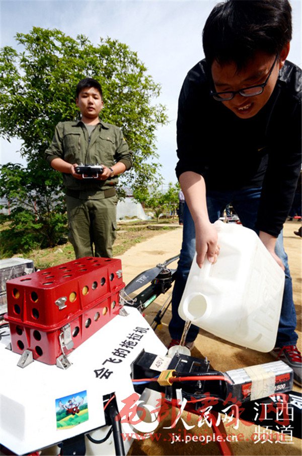 “飛手”正在給無人機搭載的藥箱內灌裝農(nóng)藥