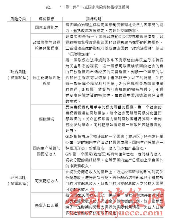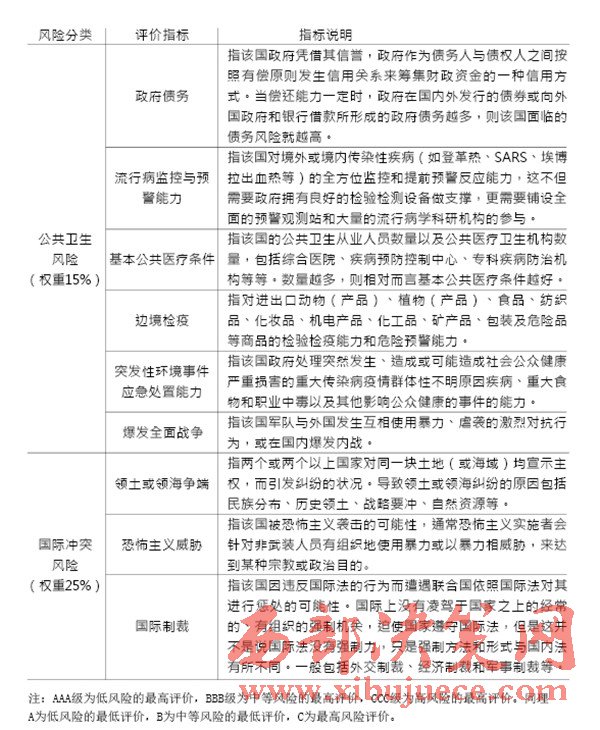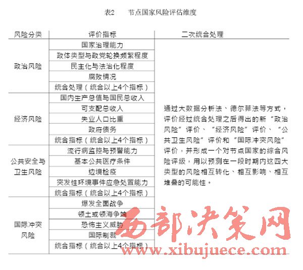 “一帶一路”建設(shè)中重要國(guó)家的治理風(fēng)險(xiǎn)是我們的主要關(guān)注對(duì)象,在借助國(guó)內(nèi)外智庫(kù)和科研院所已完成的眾多研究成果的基礎(chǔ)上,建立一套對(duì)節(jié)點(diǎn)國(guó)家風(fēng)險(xiǎn)的評(píng)級(jí)體系,如表1(見(jiàn)P28)所示。節(jié)點(diǎn)國(guó)家風(fēng)險(xiǎn)評(píng)價(jià)指標(biāo)中,政治風(fēng)險(xiǎn)與經(jīng)濟(jì)風(fēng)險(xiǎn)的評(píng)價(jià)參考經(jīng)濟(jì)學(xué)人智庫(kù)的國(guó)家風(fēng)險(xiǎn)模型(EIU country risk model);公共衛(wèi)生風(fēng)險(xiǎn)的評(píng)價(jià)參考中國(guó)衛(wèi)生與經(jīng)濟(jì)社會(huì)發(fā)展統(tǒng)計(jì)數(shù)據(jù)庫(kù)對(duì)公共衛(wèi)生的指標(biāo)設(shè)計(jì);國(guó)際沖突風(fēng)險(xiǎn)評(píng)價(jià)根據(jù)經(jīng)濟(jì)學(xué)人智庫(kù)發(fā)布的白皮書(shū)《愿景與挑戰(zhàn)——“一帶一路”沿線國(guó)家風(fēng)險(xiǎn)評(píng)估》與中國(guó)出口信用保險(xiǎn)公司發(fā)布的2015年版《國(guó)家風(fēng)險(xiǎn)分析報(bào)告》和《全球風(fēng)險(xiǎn)地圖》綜合考量得出。具體而言,我們可以從“政治風(fēng)險(xiǎn)”“經(jīng)濟(jì)風(fēng)險(xiǎn)”“公共衛(wèi)生風(fēng)險(xiǎn)”和“國(guó)際沖突風(fēng)險(xiǎn)”四個(gè)維度來(lái)評(píng)估選擇出的節(jié)點(diǎn)國(guó)家的風(fēng)險(xiǎn),如表2(見(jiàn)P30)所示。