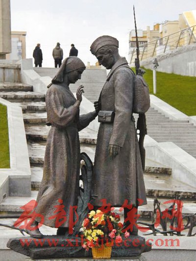 白俄羅斯衛(wèi)國戰(zhàn)爭(zhēng)歷史博物館入口處,立著一座雕像,背著槍的紅軍戰(zhàn)士正同心愛的姑娘依依惜別,雕像前常年鮮花不斷