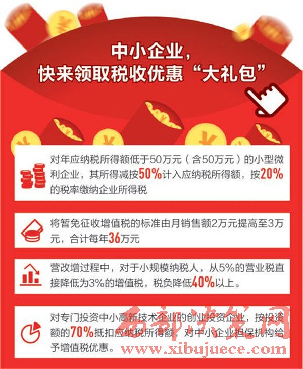 日前國(guó)務(wù)院常務(wù)會(huì)議決定,在今年已出臺(tái)4批政策減稅降費(fèi)7180億元的基礎(chǔ)上,繼續(xù)出臺(tái)多項(xiàng)降費(fèi)舉措,預(yù)計(jì)每年可再減輕企業(yè)負(fù)擔(dān)2830億元,合計(jì)全年為企業(yè)減負(fù)超過(guò)1萬(wàn)億元。今年以來(lái),國(guó)家持續(xù)推出減稅降費(fèi)措施,讓企業(yè)輕裝上陣,成為推進(jìn)供給側(cè)結(jié)構(gòu)性改革、培育我國(guó)競(jìng)爭(zhēng)新優(yōu)勢(shì)的重要舉措。就在國(guó)務(wù)院出臺(tái)多項(xiàng)降費(fèi)舉措的同時(shí),財(cái)政部、國(guó)家稅務(wù)總局也發(fā)出通知,將享受所得稅優(yōu)惠政策的小型微利企業(yè)年應(yīng)納稅所得額上限由30萬(wàn)元提高至50萬(wàn)元,自2017年1月1日至2019年12月31日,對(duì)年應(yīng)納稅所得額低于50萬(wàn)元(含50萬(wàn)元)的小型微利企業(yè),其所得減按50%計(jì)入應(yīng)納稅所得額,按20%的稅率繳納企業(yè)所得稅。