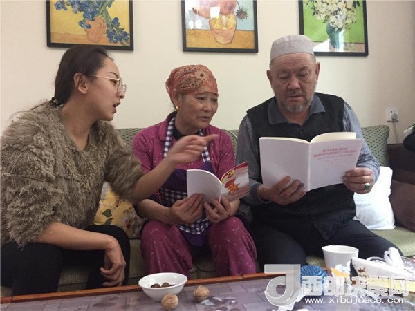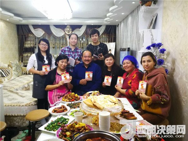 傍晚,一大群來自不同民族,不同單位的新疆兒女聚在了一起,紛紛加入到這個(gè)民族團(tuán)結(jié)的大聚會(huì)里,彈一首歡快悅耳的冬不拉,舞一曲深情優(yōu)美的賽乃姆,唱一首民族團(tuán)結(jié)的贊歌,將整個(gè)聚會(huì)推向高潮。賽買提·阿合買提高興地說:“我今天太開心了!這個(gè)結(jié)婚紀(jì)念日太有意義了,你的親戚,我的親戚,變成了我們的親戚,以后這就是你們的家,你們要經(jīng)常來啊!” 趁著大家都在興頭上,韓莉書記又拿出學(xué)校專門印制的《不忘初心 牢記使命-黨的十九大精神進(jìn)校園讀本》,熱情地為親戚們宣傳起十九大精神,給大家講起黨的好政策來。在得知艾來提·賽買提目前還沒有找到合適的工作,沒有穩(wěn)定收入的情況后,大家立刻表示愿意幫助他早日找到合適的工作,幫助他們解決最實(shí)際的困難,把溫暖送到他們的心坎中。大家唱唱跳跳,說說笑笑,其樂融融,在互幫互助中讓民族團(tuán)結(jié)之花越開越艷。