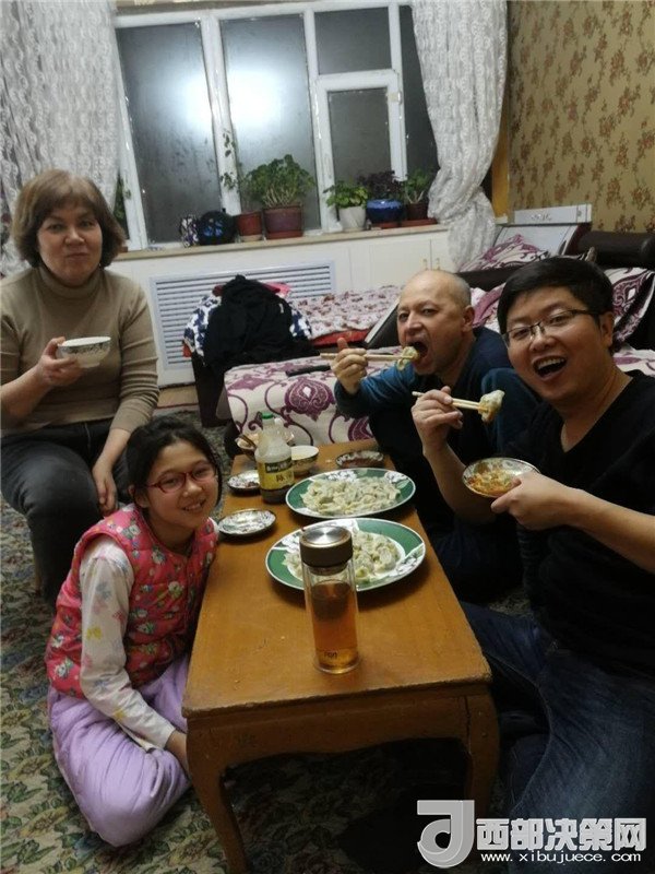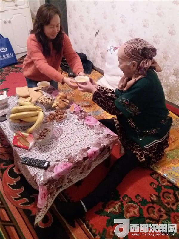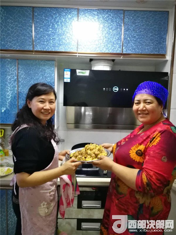 艾來提·賽買提的父親賽買提·阿合買提一面接過韓莉書記手里的米、面、清油和兩大兜食材,一面心疼地埋怨:“這么冷的天,你們又拿這么多東西,多辛苦,你上次送來的東西還沒有吃完呢。”韓莉和王艷萍笑而不語(yǔ),心里默默地盤算著帶給親戚意外的驚喜。因?yàn)榘瑏硖?middot;賽買提和愛人長(zhǎng)期兩地分居,聚少離多。今天正好是他們父母結(jié)婚三十周年紀(jì)念日,她們?nèi)嗽缇蜕塘亢靡欢ㄒH手做一頓飯,邀請(qǐng)這個(gè)民族團(tuán)結(jié)大院里附近的同事和各自的親戚一起來給這個(gè)小家庭舉辦一場(chǎng)別開生面的大融合聚會(huì),她們忙碌著,擇、洗、炒,撲鼻的香味彌漫在親戚的家中……