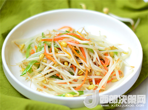 綠豆制豆芽100克、胡蘿卜炒豆芽3/1個(gè)、水制豆芽適量、荷蘭豆炒豆芽20克、蒜炒豆芽3瓣。