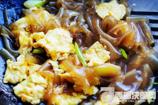 等粉皮炒到油亮后倒進(jìn)事先炒好的雞蛋,大火翻炒均勻入味,臨出鍋灑上香菜段或韭菜段
