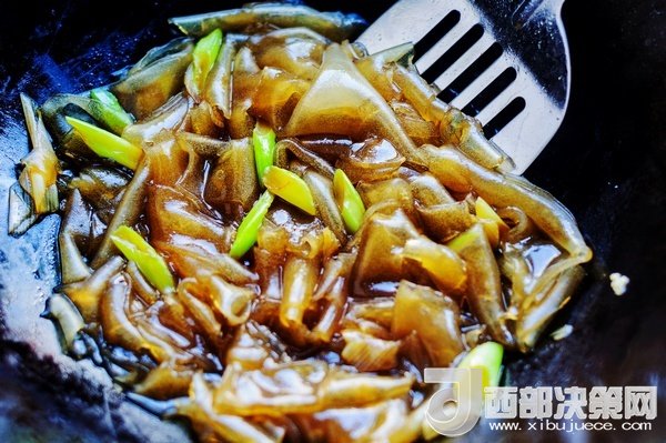 把粉皮從清水里,撈出放進(jìn)炒鍋大火翻炒。