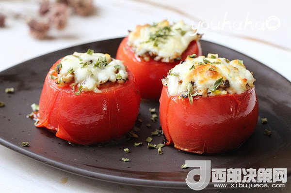 7、到時取出烤盤,西紅柿裝盤,撒少許的干蔥即可。