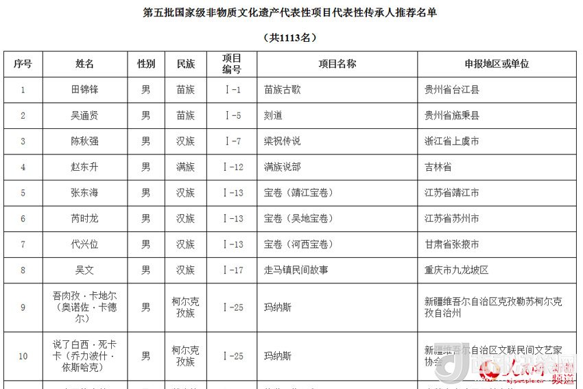 在各地推薦申報的基礎(chǔ)上,各評審組專家對全國31個?。▍^(qū)、市)、新疆生產(chǎn)建設(shè)兵團、中央有關(guān)部門及港澳地區(qū)推薦的申報人進行了評審,經(jīng)評審委員會審議,提出了第五批國家級非物質(zhì)文化遺產(chǎn)代表性項目代表性傳承人推薦名單(共1113人)。其中對尚未認定過國家級代表性傳承人的項目,本次推薦827人,對已認定過國家級代表性傳承人的項目,本次推薦286人。