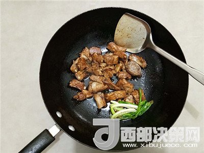5.鍋中放少許油,放入焯過水的排骨稍微炒一下,放入生抽、老抽、冰糖、燉肉料包、生姜、香蔥等調(diào)料