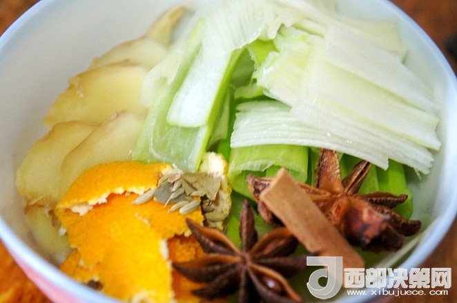 輔料:油適量 鹽適量 生抽適量 老抽適量 蔥姜適量 大料適量 肉桂適量 小茴香適量 淀粉適量 橘皮適量 蠔油適量 糖適量 香葉適量