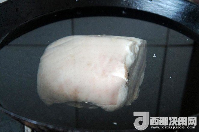 9.待五花肉稍微冷卻至不燙手時,將其切成肉片,皮朝下碼入圓底的搪瓷盆中,待用
