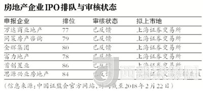 據(jù)中國證監(jiān)會最新公布的《發(fā)行監(jiān)管部首次公開發(fā)行股票審核工作流程及申請企業(yè)情況》顯示,截至2018年2月22日,證監(jiān)會受理首發(fā)企業(yè)438家,其中,已過會27家,未過會411家。未過會企業(yè)中正常待審企業(yè)404家,中止審查企業(yè)7家。其中,在“涉房”企業(yè)中萬達(dá)商業(yè)地產(chǎn)、富力地產(chǎn)、同策房產(chǎn)咨詢、金輝集團(tuán)、首創(chuàng)置業(yè)等繼續(xù)保持“已反饋”狀態(tài)。按照申報(bào)企業(yè)排序,分別位列77、78、79、80、86名。