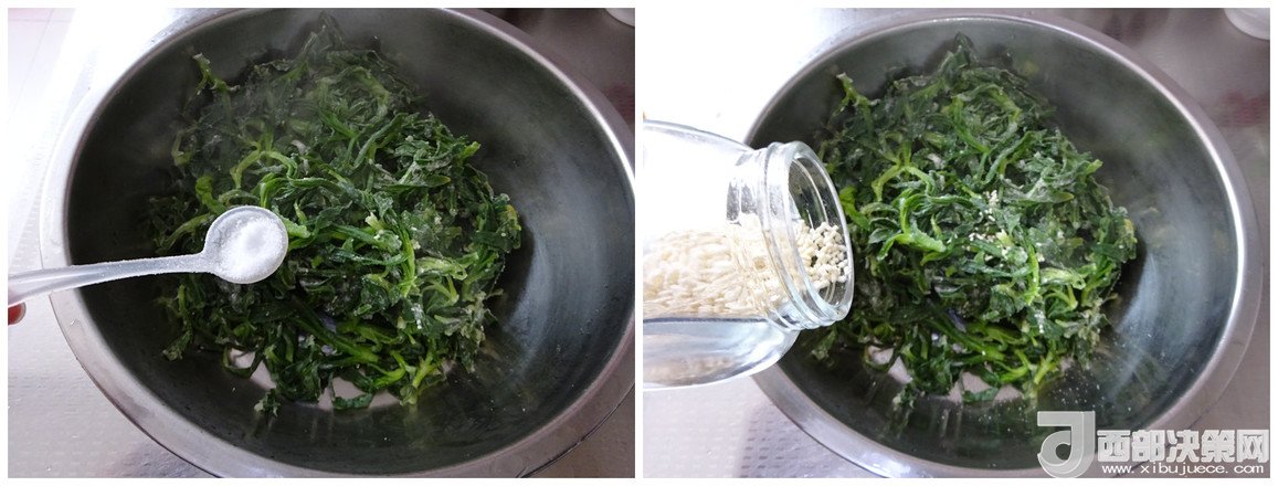 4.取出放入大盆中,趁熱放入鹽、雞精,用筷子挑散