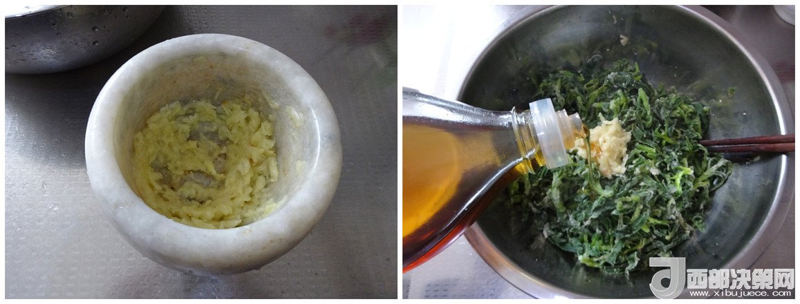 5.大蒜放一丟丟鹽搗成蒜泥,放入盆中,倒入適量的香油,拌勻即可,每到這個(gè)時(shí)候我就會開始流口水了,香油和蒜泥混合后的香氣,太誘人了 記住,吃蒸菜必須放蒜泥,不然味道減一半哦